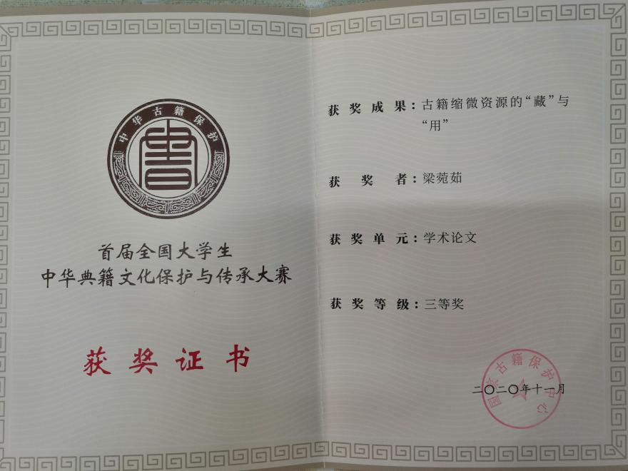 依托文献信息管理实验室,学生对古籍文献产生极大兴趣,2019级梁婉茹同学在“全国大学生中华典籍文化保护与传承”大赛中获得三等奖。