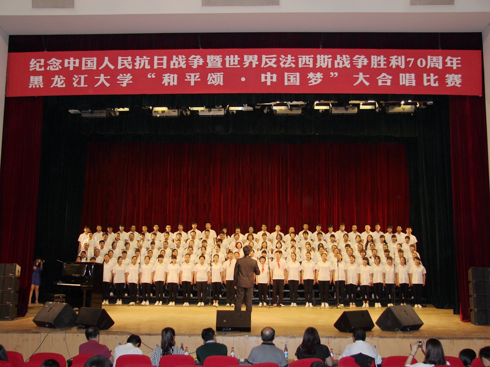 此次合唱比赛系我校纪念中国人民抗日战争暨世界反法西斯战争胜利70周年系列活动的“重头戏”。学院院长马海群老师,书记黄丽霞老师,副院长赵建平老师,副书记副院长王法山老师以及学院22名教师积极参与,使这一活动真正做到了集合全校关注和全校参与,凝聚全体黑大人的力量和情感。历经一个多月的排练,学院师生拿出排除万难、坚持不懈的精神,利用业余时间投入紧张的排练,用歌声表达了致敬历史、献礼祖国的情怀,也是黑大人团结一致、众志成城的充分彰显。