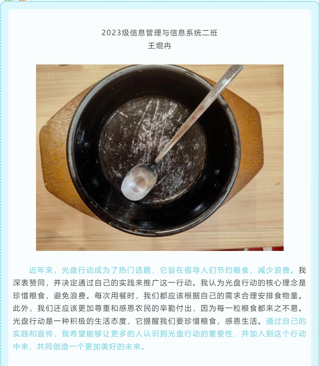 桑田碧海须臾改,节俭之风不可移。为响应习近平总书记对“厉行节约,反对浪费”的号召,进一步增强同学们珍惜粮食的意识,养成良好的饮食习惯,摒弃浪费之风,树立健康理念,携手共建“节约型”校园,华体会官方网页版于11月26日至12月4日开展“不负‘食’光,你我同行”光盘打卡活动。本次“不负‘食'光,你我同行”光盘打卡活动在信管学子的参与下,取得了非凡效果,帮助同学们在接下来的生活中杜绝“舌尖上的浪费”,牢记“谁知盘中餐,粒粒皆辛苦”的不易,从生活习惯开始,从节约粮食做起,真真正正地让节俭美德内化于心、外化于行。