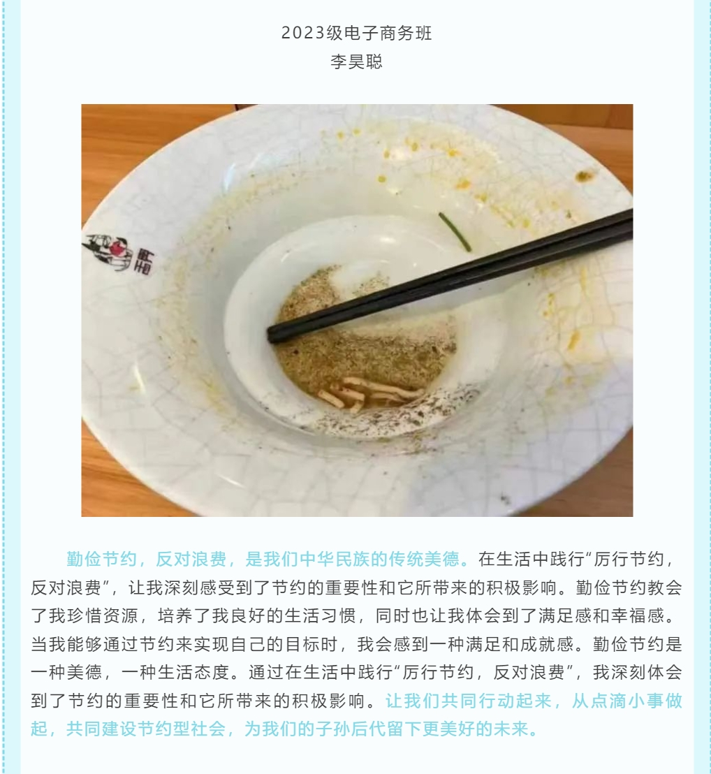 “厉行节约、反对浪费”不仅是一句简单的号召,更是我们需要长期躬身实践的行为。作为新时代青年学生应做勤俭节约的传播者、践行者、推广者,做到“君子以俭德辟难,不可荣以禄”。未来,信管学子将以更加饱满的热情积极投身到勤俭节约的行列之中,用行动书写新时代青年勤俭节约的壮丽答卷,让绿色之风盛行在生活的每一处角落!(华体会官方网页版供稿)