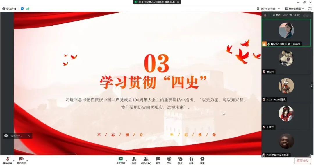 领学人王露同学从党的二十大精神入手,依次介绍了中国共产党的中心任务、五个“坚持”、三个务必、三件大事。并从学习贯彻四史切入,以传承龙江优秀精神为总结,向大家阐明了学习四史的意义。她强调青年强,则国家强,当代中国青年生逢其时,施展才干的舞台无比广阔,实现梦想的前景无比光明。广大青年要坚定不移听党话、跟党走,怀抱梦想又脚踏实地,敢想敢为又善作善成。最后,王露同学呼吁我们要传承和弘扬新时代黑龙江优秀精神,在现代化国家建设中担起更大责任,展现更大作为。
