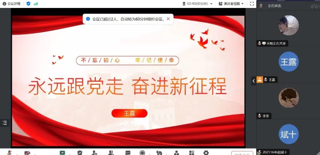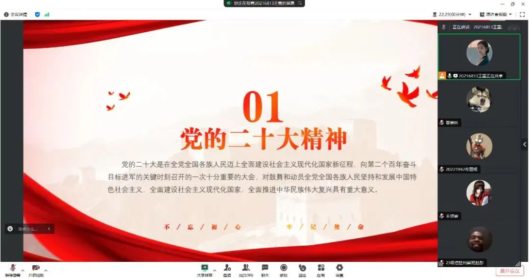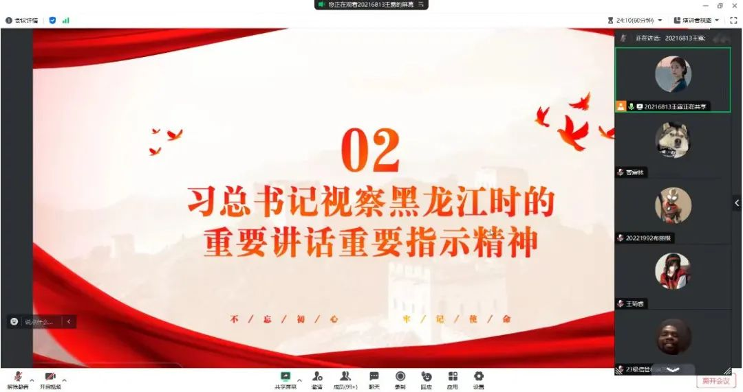 为贯彻习近平总书记视察黑龙江时的重要讲话重要指示精神,深入学习“四史”、龙江优秀精神等,引导青年学子深刻领悟“两个确立”的决定性意义,华体会官方网页版于2024年1月22日晚上7点在腾讯会议开展了寒假“十个一”学生党员领学活动。本次会议以“永远跟党走,奋进新征程”为主题,由2021级学生党员王露同学主讲,华体会官方网页版全体同学参会。