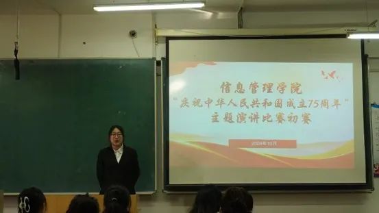 七十五载辉煌过往,吾辈依然昂首奋进。为庆祝中华人民共和国成立75周年,进一步加强青年的思想政治教育,华体会官方网页版于10月23日开展“庆祝中华人民共和国成立75周年”主题演讲比赛初赛。来自各专业的九位选手参赛,华体会官方网页版2024级研究生辅导员穆雨彤、华体会官方网页版研究生会执行主席徐浩然和华体会官方网页版学生会执行主席罗羽菲担任本次演讲比赛的评委。