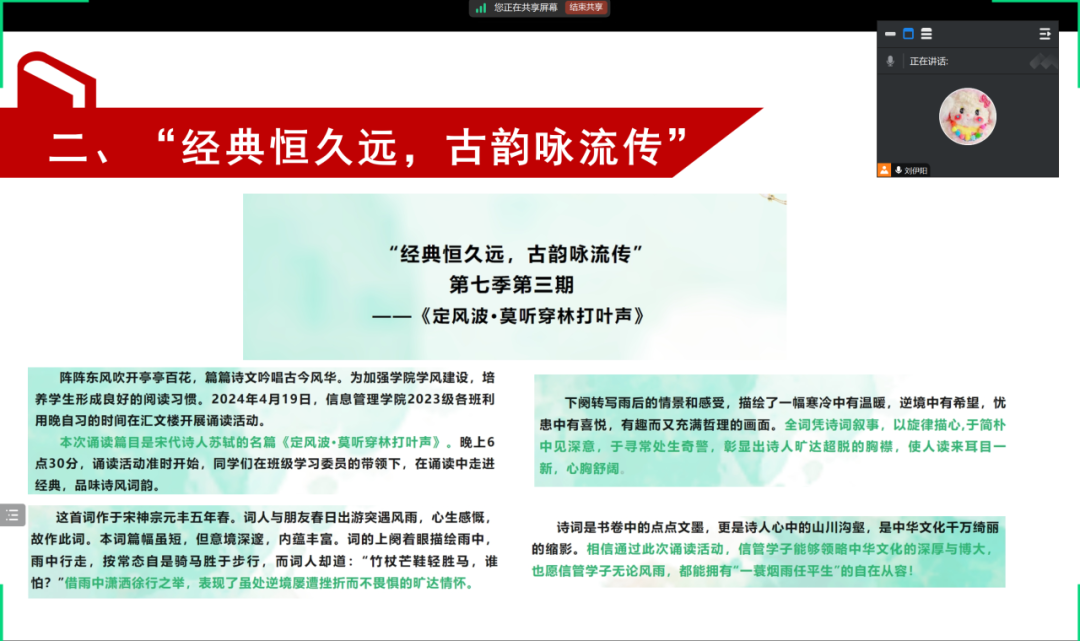 会议伊始,刘伊阳首先明确了“经典恒久远,古韵咏流传”诵读活动的拍摄与文稿撰写要点。她指出,活动拍摄时应注意光线条件,避免画面过暗或过曝,确保照片清晰度。随后她鼓励2024级同学在撰写文稿时进行原创,并强调若引用他人资料需注明出处,确保信息准确性。