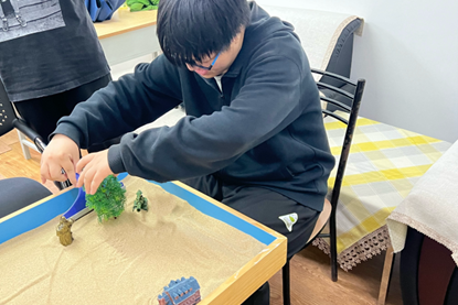 随后,同学们按照规则依次在沙盘中挑选自己心怡的沙具,通过移动沙具,摆出自己想要的场景,进而展现自己的情感和想法。活动的最后,王硕老师引导同学们表达每一个沙具和场景给自己带来的感受与想法。同学们通过分享自己的感受与想法,深化了对彼此的了解。