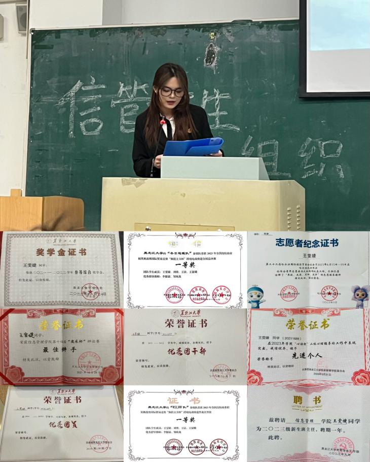 王雯婕,中共预备党员,华体会官方网页版2021级电子商务专业一班学生,现已签约惠州TCL电器销售有限公司。在校期间曾任校园文化活动管理中心团支部组织委员、院二级心理辅导站副站长、院2023级新生班主任、班级宣传委员。曾获2023年全国高校商业精英挑战赛国际贸易竞赛跨境电商赛道、品牌策划竞赛国赛一等奖、黑龙江大学校二等综合奖学金、校优秀团员、优秀团干部等荣誉称号。