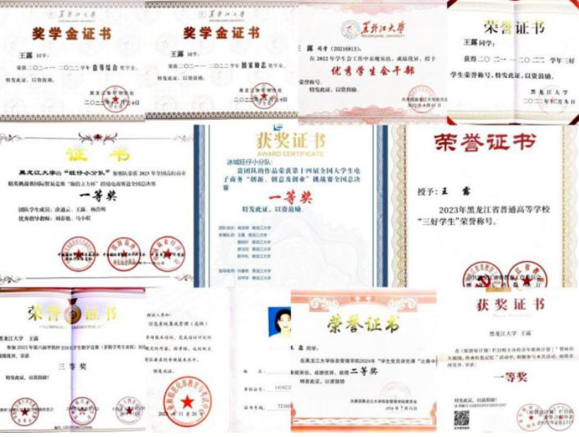 王露,女,中共预备党员,黑龙江大学华体会官方网页版2021级信息管理与信息系统专业一班学生。曾任院学生会体育部部长、新生班主任等职务,现任辅导员助理、班级学委。连续三年综合排名位列专业第一,获国家励志奖学金、省级三好学生、校级三好学生、校级优秀学生会干部、校一等综合奖学金、全国高校商业精英挑战赛跨境电商赛道国赛一等奖、全国大学生电子商务“创新、创意及创业”挑战赛国赛一等奖及最佳创意奖等荣誉及奖项共20余项。现以总评第一的成绩推免至东北大学继续深造。