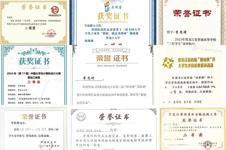 在大学期间,我始终坚持“学一科、爱一科、精通一科”的学习理念,认真学好每一门专业课,从大一开始,我就积极参与各种竞赛和科研实践。在专业竞赛上,我先后获得第四届高校档案学专业大学生课外科技作品展校二等奖、上海大学第二届“泮池杯”最佳创意作品奖、云南大学图书情报与档案管理微电影节一等奖等,为了提升我的综合素质与能力,我还参加了电子商务三创赛、挑战杯、中国大学生计算机设计大赛等竞赛,获得省校级奖项若干。在科研方面,我主持了校级大创一项、参与省级大创两项,科研项目两项,对档案学专业有了进一步的了解和思考,并逐渐找到了自己的研究兴趣。在实践方面,我在黑龙江省招生考试院、黑龙江省委党校进行了专业实习,了解了档案工作实务,深刻地感受到档案工作者的职责所在;我从2023年开始在“档案那些事儿”学生联络员团队和ICA国际档案理事会中宣组实习,深入了解了档案学的前沿动态,在实践中不断提升了自己的专业技能,与来自全国各地的档案学专业同学和档案工作者共同交流学习。