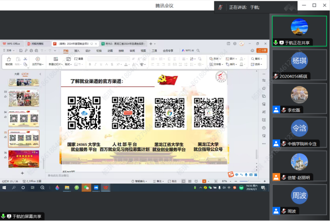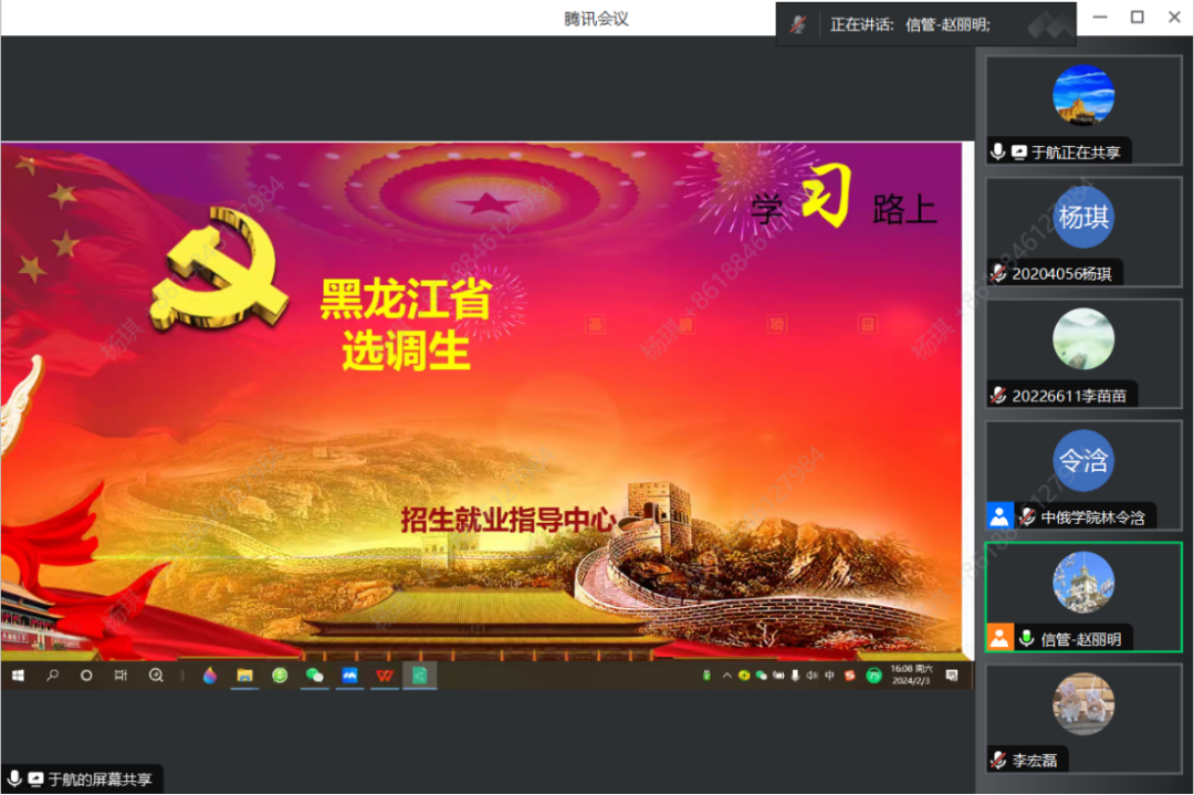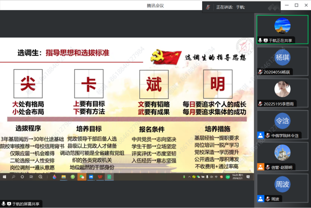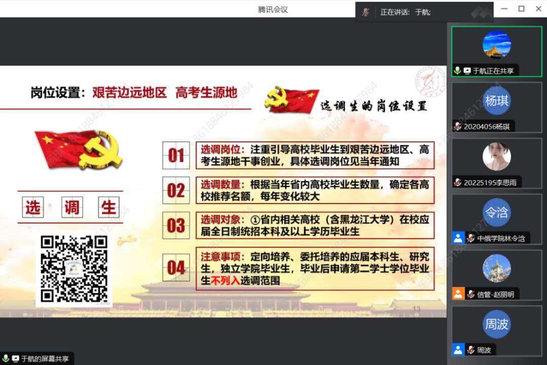 为进一步开展2024届毕业生就业工作,加强毕业生对选调生的认知,明确相关政策和具体要求,全力促进毕业生高效充分就业。华体会官方网页版联合中俄学院,于2024年2月3日16:00在腾讯会议开展2024年选调生政策解读讲座。本次讲座由黑龙江大学招生就业指导中心就业指导部主任于航老师主讲,华体会官方网页版党委副书记赵丽明老师主持,中俄学院党总支副书记周波老师、华体会官方网页版与中俄学院全体辅导员老师、2024届本硕毕业生和部分低年级学生共同参会。