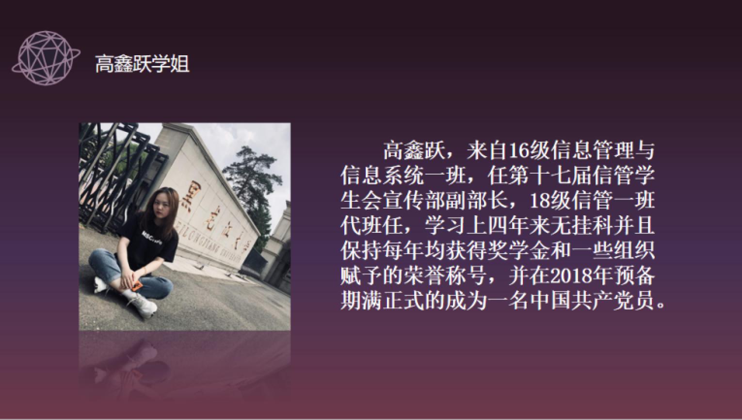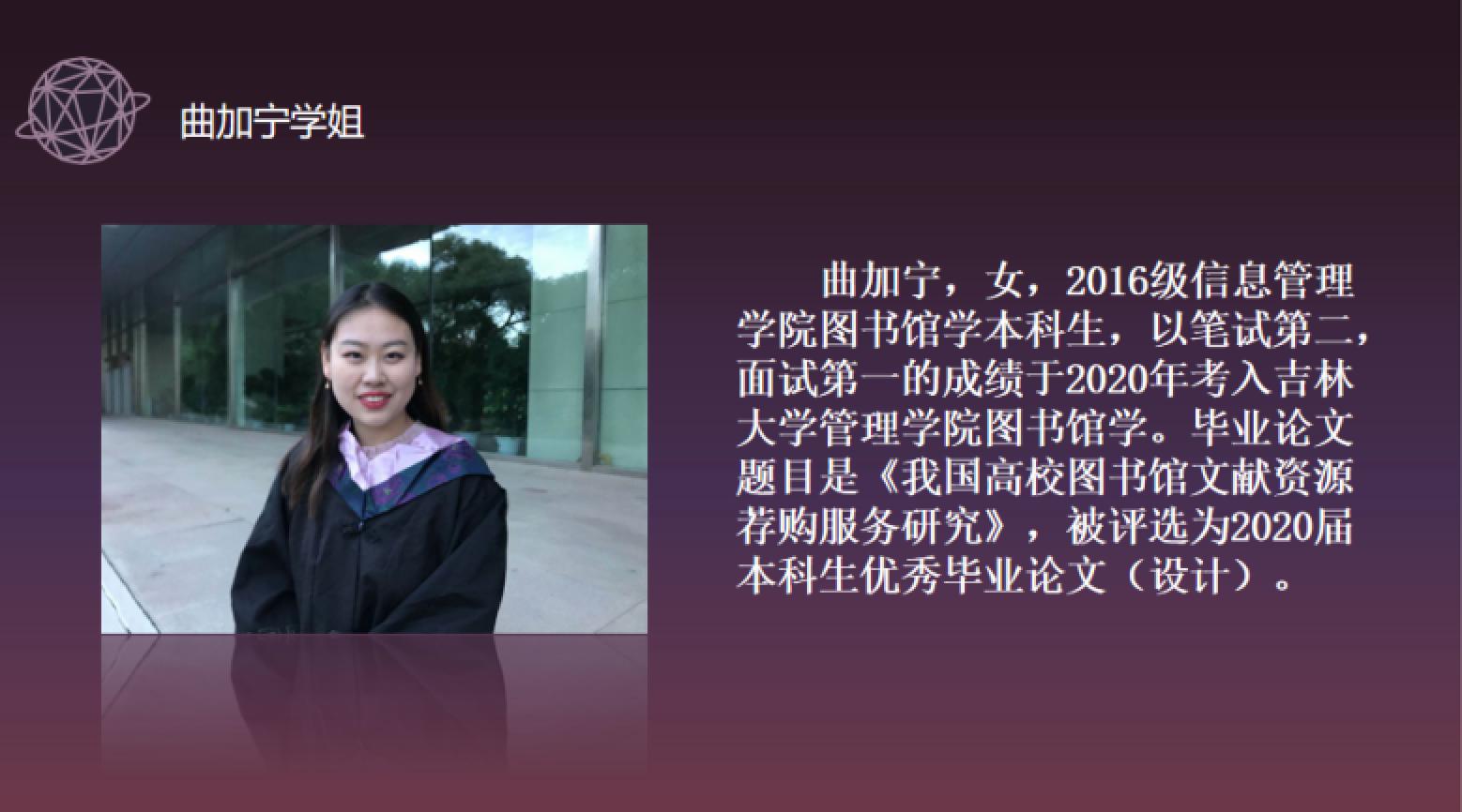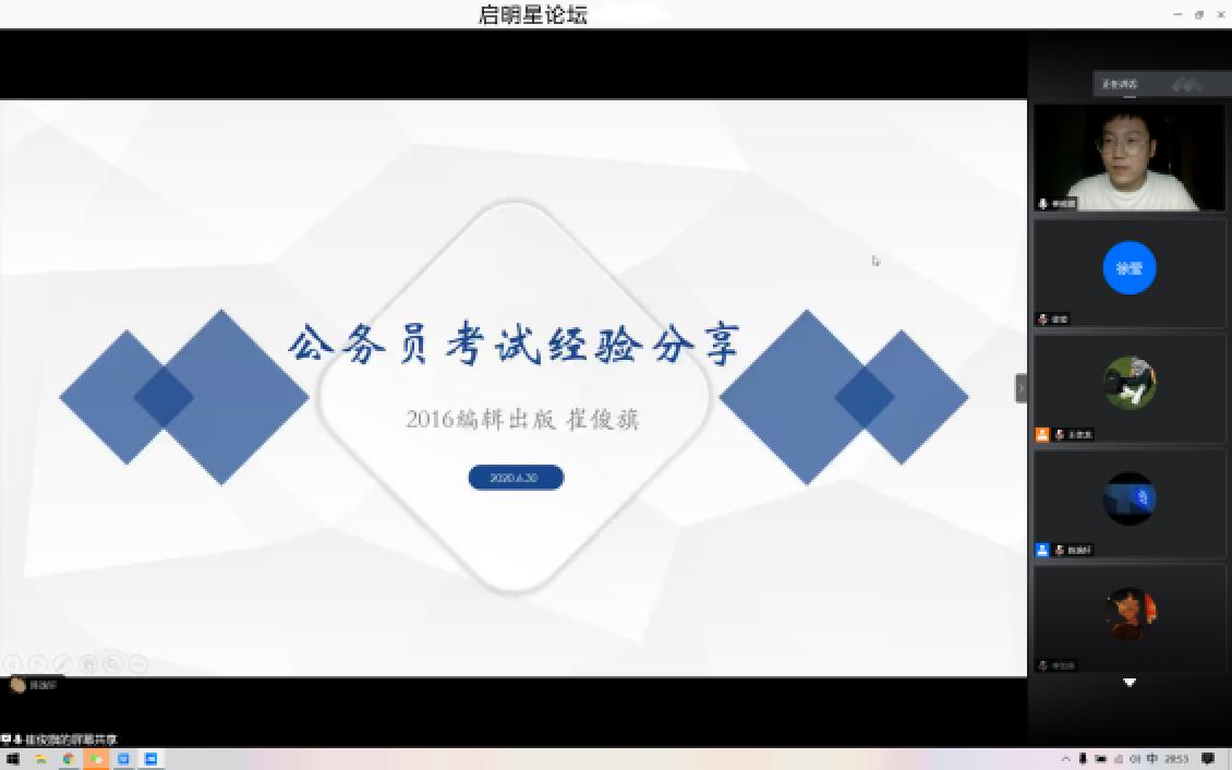 主持人首先对“启明星论坛”进行介绍。该项活动作为我院多年的品牌项目,以突出“交流、互动、学习技巧分享”的宗旨和解决同学们学习和生活中的问题为目的,让广大信管学子深深收益。虽然由于突如其来的疫情,无法让同学们与学长学姐面对面交流,但是越是在这样特殊的时刻,优秀的经验越能为同学们带来鼓舞,启明星也一直陪伴着信管学子们成长。今年的“启明星论坛”活动以演讲加提问互动相结合的形式进行,从保研、考研、考公、就业等方面向同学们分享经验。