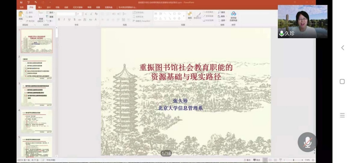 因受新冠肺炎疫情影响,整场报告以在线会议的方式进行,但这丝毫不影响报告的精彩性。张久珍教授的报告引经据典,内容丰富,学术含量高,尤其是她分享了大量由其亲自参与的图书馆社会教育活动的案例,为全院师生在图书馆社会教育方面的研究与思考拓展了视野,也为华体会官方网页版校庆系列学术报告活动来开了大幕。