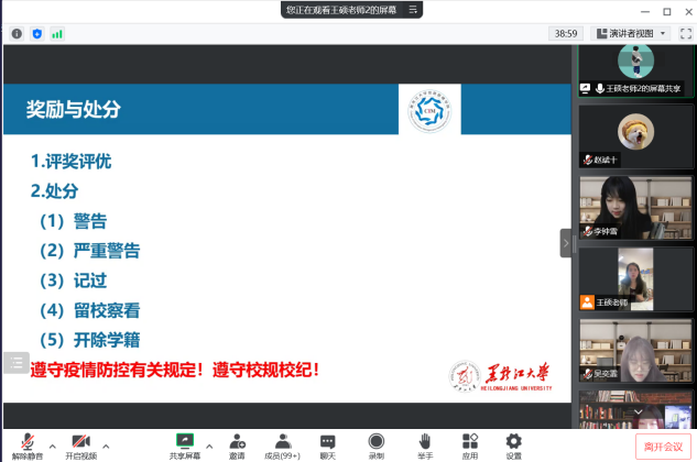 随后,王硕老师从疫情防控、学生安全、新生报到、报到后安排、党团关系转接、困难生认定、降级处分、学业预警等各方面,为同学们做了详细的解读,让全体同学对入学报到的相关要求及入学后的管理制度等有了全面的了解。