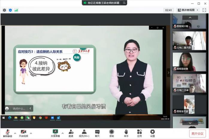 首先,尹静老师向2022级新生们列举了几项在大学生活中会遇到的挑战:适应新环境、学习新挑战、人际关系的处理等。在列举这些问题后,尹静老师给同学们提出几点有效适应大学生活的方法和技巧。