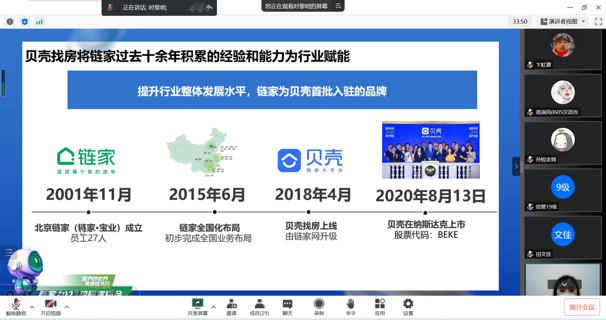 接下来,时黎明按照初识行业及链家、职业画布、福利地图、应聘指南的顺序分别向同学们做出了详细介绍。北京链家具备高效的线上线下一体化服务能力,拥有过万名从业五年以上的社区专家,结合链家网和贝壳找房的楼盘字典、地图找房、VR看房、交易可视化等创新技术和产品,为消费者提供智慧高效的服务体验。以“国民链家,品质为先”为品牌理念,以“成为中国房产服务业的国民品牌”为愿景,北京链家将不断创新发展,为万千家庭提供更加安心、高效、有品质的房产交易服务,进一步推动经纪人的职业化发展,成为率先迈入4.0时代的房产经纪品牌。