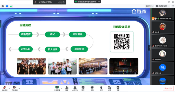 时黎明还结合同学们所关心的重点问题,针对招聘岗位、工作职责、任职要求、薪资结构、福利保障、晋升通道、培训体系等方面做出详细说明。链家集团坚持清晰化、多元化的晋升通路,实行全面性、阶段性的培训体系,精确助力经纪人职业发展,打造成员专属荣誉感,贯彻有荣誉、有氛围、有发展、有培训、有保障的链家理念。
