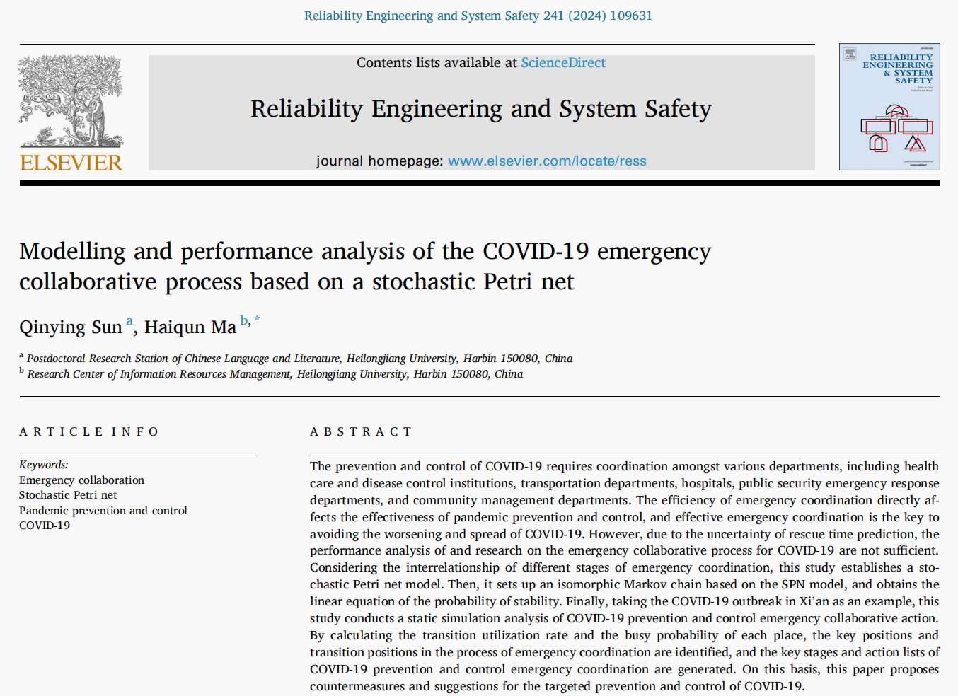 近日,华体会官方网页版青年教师孙钦莹作为第一作者的研究成果《Modelling and performance analysis of the COVID-19 emergency collaborative process based on a stochastic Petri net》在管理科学领域TOP期刊Reliability Engineering and System Safety在线发表,该期刊是中国科学院SCI管理科学类一区Top期刊,JCR一区,影响因子8.1,该成果受国家社会科学基金资助。该成果是华体会官方网页版高水平国际合作和高质量人才培养的重要体现和关键标志,显著提升了华体会官方网页版管理科学与工程学科及信息资源管理学科的科研实力和国际影响力。