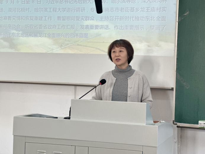 在授课过程中,黄丽霞教授从“坚定不移沿习近平总书记指引的方向勇毅前行”、“切实肩负龙江振兴发展使命”、“贯彻推动龙江振兴发展取得新突破”三个方面展开系统阐释。她用系统简洁的论述、鲜活生动的事例、亲近平和的语言、明白晓畅的逻辑,引导青年学生深刻理解习近平总书记视察黑龙江重要讲话重要指示精神,坚定青年学子认真学习、扎根龙江的信心与决心。