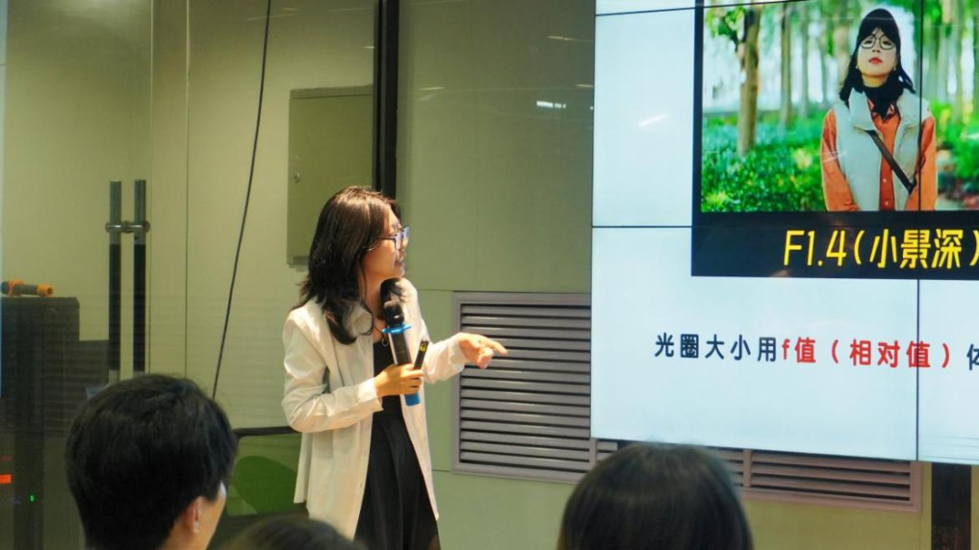 在摄影培训部分,高宇阳从摄影基础知识、相机使用及构图三方面进行讲解。她详细介绍了相机的结构、分类及区别,向同学们普及了相机的成像原理及其基本使用方法,她以索尼ZVE-10为例进行具体讲解,列举同学们拍摄时可能出现的问题进行分析,并从光线运用、距离掌握和构图原则等基础知识出发,结合实际拍摄案例,进行了深入的剖析和教学。最后,王硕对目前拍摄存在的问题进行分析,对照片的构图、平稳度、清晰度等方面提出具体要求。