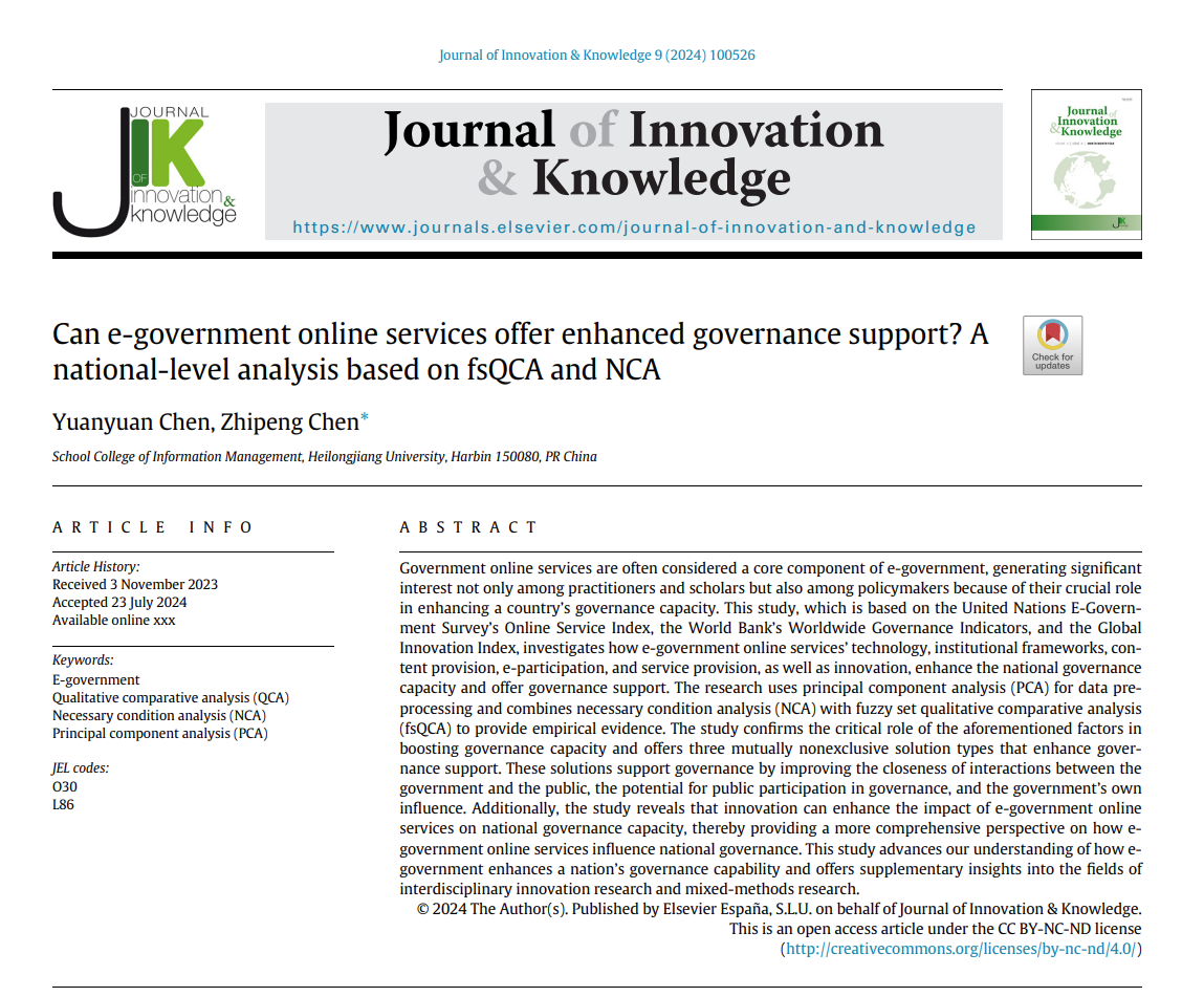 Chen Y, Chen Z. Can e-government online services offer enhanced governance support? A national-level analysis based on fsQCA and NCA[J]. Journal of Innovation & Knowledge, 2024, 9(3): 1-15. DOI:10.1016/j.jik.2024.100526.
