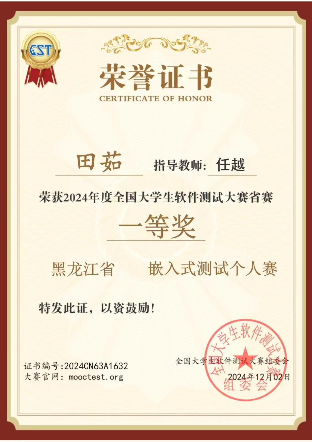 此前11月16日在牡丹江师范学院承办的“全国大学生软件测试大赛-嵌入式个人赛”黑龙江省赛区的选拔中,田茹同学获得一等奖,顺利入围全国总决赛。