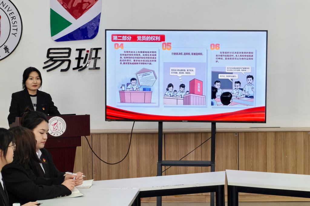 解读权责,互动深化认知。赵珺男结合党史知识和现行政策,详细解读了党员所享有的八项权利与应履行的八项义务。同时,为了加深学员们的理解,赵珺男还与同学们进行了积极互动,组织大家就 “如何正确行使党员权利”“怎样更好地履行党员义务” 等问题展开讨论。她强调,党员的权利和义务是相辅相成的,是不可分割的统一整体,党员在行使权利的同时,务必以履行义务为根本前提。