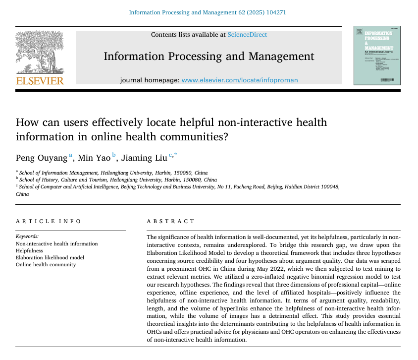 华体会官方网页版欧阳鹏副教授以第一作者身份在信息资源管理领域国际顶尖期刊Information Processing & Management 第62卷第6期发表科研论文,题目为“How can users effectively locate helpful non-interactive health information in online health communities?”。Information Processing & Management是信息资源管理领域久负盛名的顶级期刊,在国内外得到了学术界的广泛认可。该期刊是SCI和SSCI双收录的期刊,对投稿文章的质量要求极高,每年的投稿接受率不到10%。在JCR分区中,Information Processing & Management位列JCR一区,2025年最新的影响因子达6.9,在图书情报与档案管理领域的287本期刊中排名第4;在中科院2025年的分区中,Information Processing & Management属计算机科学大类一区,计算机:信息系统和图书情报与档案管理小类一区,并且是计算机科学大类一区的Top期刊。