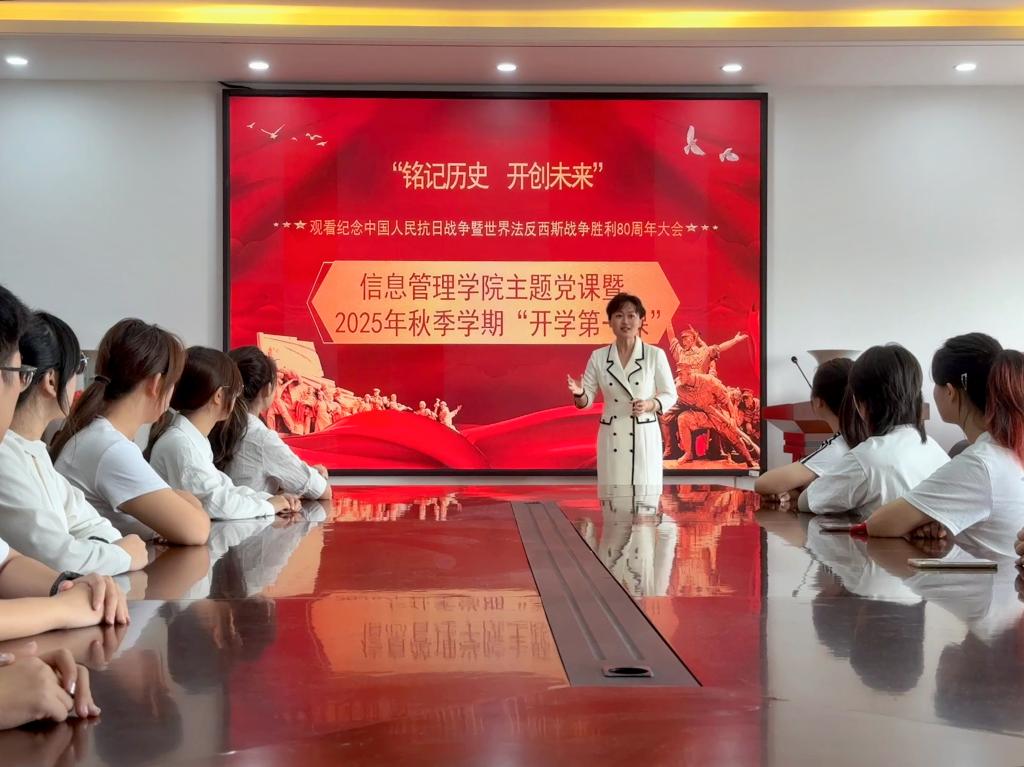 2025年9月3日上午,纪念中国人民抗日战争暨世界反法西斯战争胜利80周年阅兵式在北京天安门广场隆重举行。黑龙江大学华体会官方网页版以此为契机,由学院党委书记袁立莉主讲,组织开展了以“铭记历史 开创未来”为主题的党课暨2025年秋季学期“开学第一课”教育活动。学院全体师生代表集体观看阅兵直播,共同上了一堂生动而深刻的爱国主义教育课。