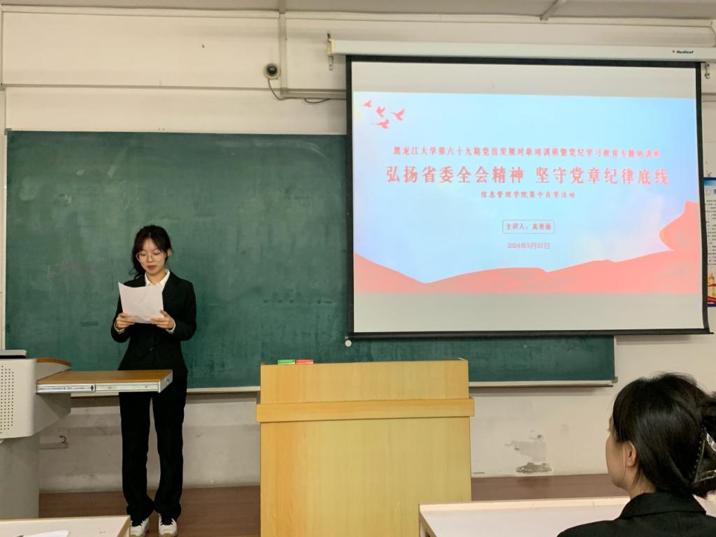 为深入学习贯彻习近平新时代中国特色社会主义思想,深入推进党纪学习教育,贯彻落实习近平总书记关于党纪学习教育的重要讲话和重要指示精神,黑龙江大学华体会官方网页版开展第六十九期党员发展对象培训班暨党纪学习教育专题培训班,培训内容包含典型领学、情景研学、实践促学、集中自学、交流互学。